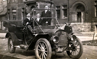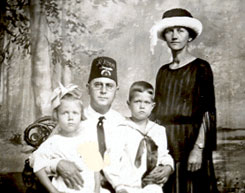 | Papa was so busy with his hundreds of patients (in one year delivering more than half of all the babies in Lorain) that he seldom could take off for a vacation. As a consequence, it was not unusual for Papa to come in from a call or the office and tell Mamma to pack up, looks like things are a bit slack, and we will leave for Waynesburg in an hour to visit the Meek and Waychoff relatives. It usually took us twelve to fourteen hours to travel the one hundred fifty miles so that, often, we would get into Pennsylvania after dark. The state was mountainous, with many creeks and streams following the valleys and flowing across the roads. Because there were few bridges, we frequently became hopelessly stuck, sometimes twice in the same evening. Papa would leave a revolver with Mamma, who was a good shot, and tell us all to stay put. Then he would walk to the nearest farmhouse, where he could usually find a farmer who was a Mason or Shriner. The farmer would recognize the Shrine pin Papa always wore |