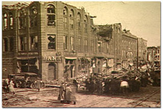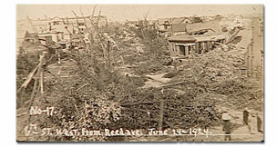 | The people who owned the house on the corner of 5th and Hamilton, a half block away, were just sitting down to eat supper. The tornado lifted up the whole house and blew it away, leaving them all sitting at the table, wet but otherwise not disturbed. The Van Deusen family, my fathers lawyer who lived on 5th about a block away, was entertaining a group of visitors and relatives. They decided to run for the basement, and lined up against the wall when the house caved in on them. It killed every other one as they stood against the wall. One of Papas friends, walking along Oberlin Ave., was picked up, lifted above the trees and houses, carried three blocks to Reid Ave. and set down as easy as a feather with no injury. Many, though, were killed when the theater downtown caved in on the occupants. The roller-skating rink, near the lake on the east side of Black River, was taken from its foundation by the tornado and thrown into the lake, skaters and all. |