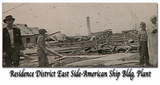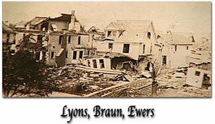 | There had been a train wreck earlier in the afternoon. A B&O freight train did not get the signal that the Railroad Turn Bridge over Black River was turned for a passing ore freighter traveling upriver to the steel plant. The train had run off the bridge into the water. Mr. And Mrs. Coulter, next door north, took Howard, Bill and Bobby, their sons, and Lilly, Mrs. Coulters sister, to see the wreck and arrived home just as the tornado hit. Howard grabbed Bobby, my best friend, took him to the back of the car and hunched over Bobby to protect him. A timber of some kind struck Howard on the back, flipped over his shoulder and struck Bobby on the head killing him. For a long time afterward, I would stand between our houses and call for Bobby to come out and play. Poor Mrs. Coulter, who was very kind, would come out to remind me that Bobby was no longer with us. I would turn sadly away, not comprehending that my pal was really gone. Ida Snyder, Mrs. Coulters other sister who lived with them, had not gone to the train wreck. She was upstairs when the tornado struck. Feeling the house rock, she rushed downstairs which descended the north wall, turned in the hallway beside their living room to run into the dining room. The piano from the living room started to move and followed behind her. Frightened, she ran to the northwest corner of the dining room, the piano still following her. The piano turned sideways, trapping her in the corner just as the upper floors caved in. The piano saved her life for the whole house had exploded, the outside walls looking like a huge barrel. When the outside walls bulged out, the floor joists were released and the floors dropped below. In the house next door south lived the Williams family. They had just returned from shopping. Papa had come home shortly before and had put his car in our garage and did something he had never done before. The early Reo cars had an emergency brake and, in addition, a ratchet on the foot brake so you could set it to hold down. Papa set both brakes before he came into the house. He had left the garage door open because in mid afternoon he would probably be called out again to visit another patient. Our driveway was common to the Williams house although Papa owned the driveway. At the edge of our garage, Mr. Williams had extended it so he could drive south of our garage and lead into his garage. Mr. Williams had just driven in when the tornado hit. He told Mrs. Williams to stay put until he could open the back door of his house. The tornado grabbed him and rolled him down the driveway and across the street into the neighbors yard without injuring him. At the same time, Papas car started rolling back down the driveway coming to a stop at the northeast corner of the Williams house , keeping the house from turning any more off its foundation. The car crossed the path Mr. Williams had taken. Why he was not run over nobody knows. |