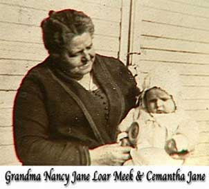 Andrew Jackson Waychoff married Cemantha Mundell, starting wonderful memories of my Grandmother, long before I had a memory. At regular intervals she had seven wonderful children, five boys and two girls. One of the girls, Nettie E. Waychoff, married "Charlie", who was her childhood sweetheart, I understand. He became my papa, who had the distinguished title of Dr. Charles R. Meek, M.D., listed in the Who's Who as an Obstetrician. Doctors did not deliver their own babies in those days, as I suppose they do not now either. Therefore, Dr. Valloyd Adair was called in to bring me to town, and they named me Cemantha Jane Meek. |