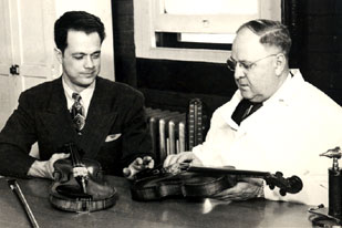 Determined to perfect the tone, he ordered from a New York City music house some old, seasoned European spruce, salvaged from destroyed houses more than a hundred years old. This was the true Tyrolean spruce of the same type used by the Cremona masters. The salvaged spruce came from a time period in which weather conditions made the wood denser than what is found today. Also, spruce from the Tyrolean Mountains in Europe is a different variety than American spruce. It does not have pitch in its fibers, so when it ages, the wood cells remain pure. It then resonates without hindrance. The first violin he made from this European spruce was excellent. It took about seven months to make it with great care. Instead of making the outside of the belly first and then calipering the inside, he determined that Stradivarius must have laid out the inside first with a flat center, and then shaped the outside with those tools to draw down the measurements to give the proper pitches when holding the node points and striking the belly. No two instruments were alike, because every piece of wood was different. He did the same with the maple back and then assembled the ribs and purfling, set the neck, and varnished it with ten coats, all hand-rubbed. They looked beautiful and had a truly wonderful tone quality. He made one for each of his sons and daughters (including the in-laws), for most of his grandchildren, one for Professor Arcule Sheesby at Northwestern University in Evanston, Illinois, and for others. He made about eighteen in all.