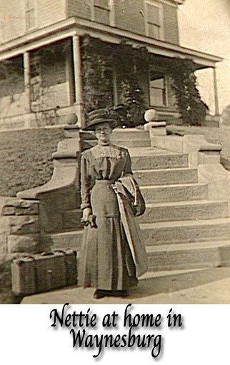 | Her diary entries through the years are predominantly a chronicle of the activities, events, and honors in the lives of all the other family members. Nonetheless, a little research reveals the social and organizational involvements and recognitions of her earlier years. As Salutatorian of her High School class of 1907, she presented a public address at graduation. The 1912 Waynesburg College (PA) yearbook, The Athenian, lists Nettie as the secretary of her Junior Class. She is pictured as an attractive brunette, the Associate Editor of Literature, one of twelve members of The Athenian editorial staff. Although only six members matriculated in her Freshman Class, numbers and influence increased so significantly in the next two years that her class instituted the first Junior Prom and produced the first yearbook that the College ever produced. She appeared as one of thirty-three members on the rolls of the YWCA. | ||||||||||||||||||||||||||||||||||||||||||||||||||||||
