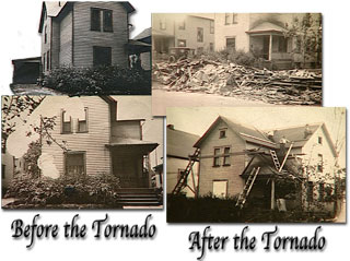 | A tornado forms a tremendous vacuum at its center. With windows and doors closed, the normal pressure inside a house creates an enormous force to equalize its pressure with the outside and will, therefore, explode like a balloon blown up beyond its capacity. Windows are blown out from within and roofs are blown off to be carted away by the excessive winds. Lorain houses had been built with slate roofs which caused much damage. After the tornado an ordinance was passed requiring all roofs to be laid with asphalt shingles. Our house was the only one for blocks around which was still structurally sound but it had no roof, all the plastering had dissolved down to the lathing, and all the windows were sucked out except the kitchen, bathroom and picture window in the front room which had the big hole in the middle. |