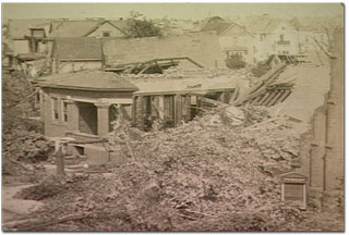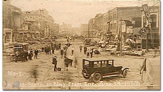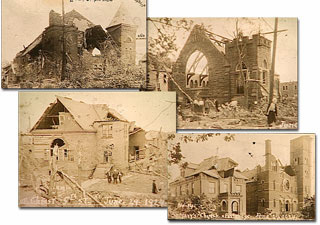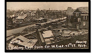| The people who owned the house on the corner of 5th and Hamilton, a half block away, were just sitting down to eat supper. The tornado lifted up the whole house and blew it away, leaving them all sitting at the table, wet but otherwise not disturbed. The Van Deusen family, my fathers lawyer who lived on 5th about a block away, was entertaining a group of visitors and relatives. They decided to run for the basement, and lined up against the wall when the house caved in on them. It killed every other one as they stood against the wall. One of Papas friends, walking along Oberlin Ave., was picked up, lifted above the trees and houses, carried three blocks to Reid Ave. and set down as easy as a feather with no injury. Many, though, were killed when the theater downtown caved in on the occupants. The roller-skating rink, near the lake on the east side of Black River, was taken from its foundation by the tornado and thrown into the lake, skaters and all. |